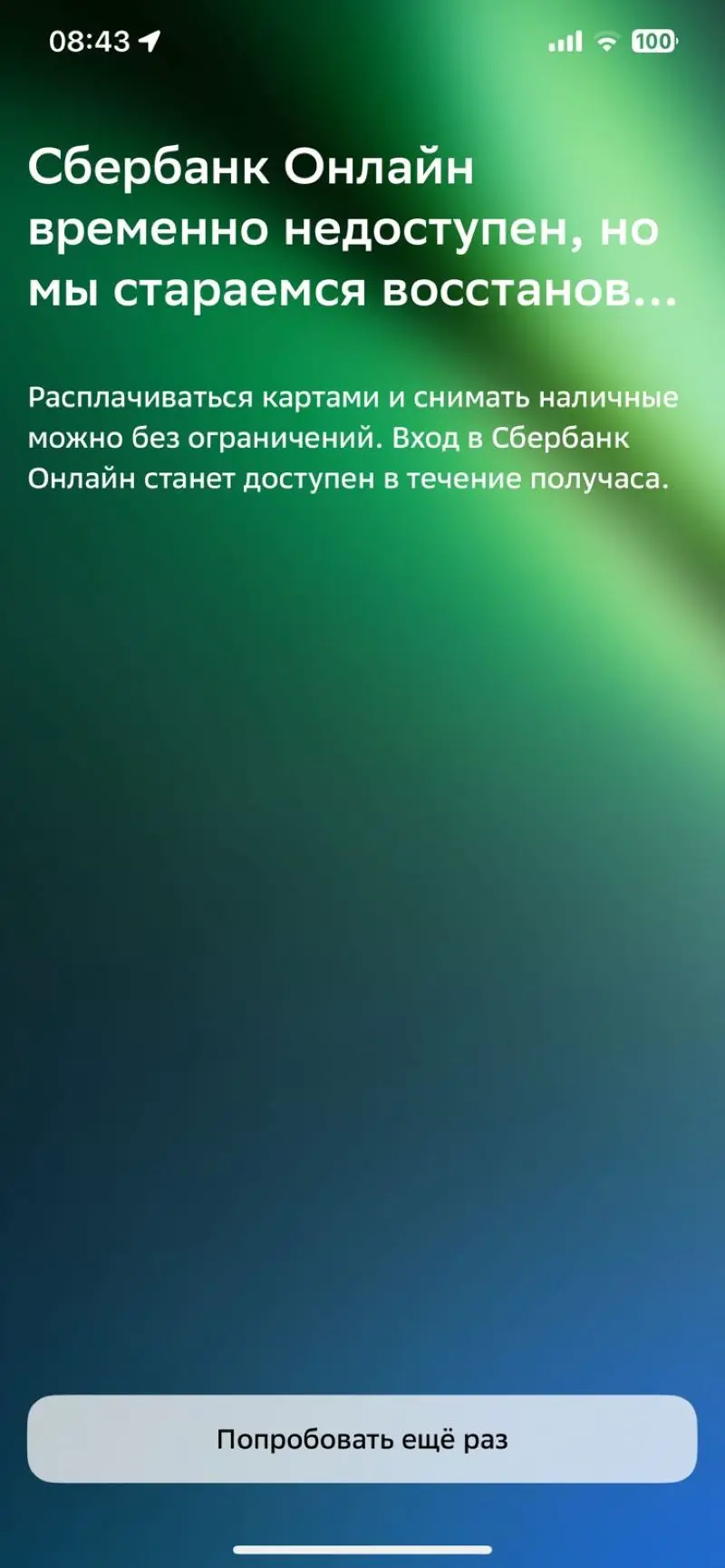 Позже пресс-служба Сбера сообщила об успешном возобновлении работы всех систем: «В настоящий момент сервисы банка функционируют в штатном режиме. Ранее могли наблюдаться кратковременные трудности с использованием некоторых услуг. Приносим извинения клиентам за доставленные неудобства». Отмечается, что параллельно в регионе фиксировались проблемы с мобильным интернетом.